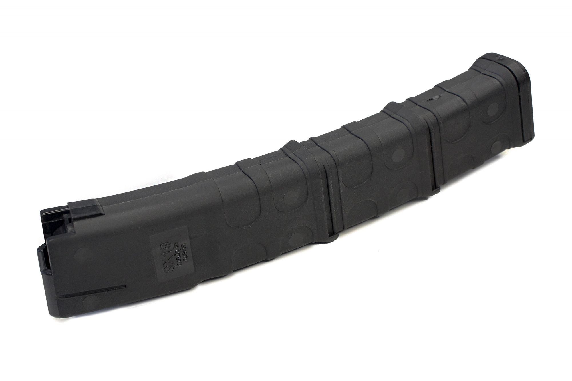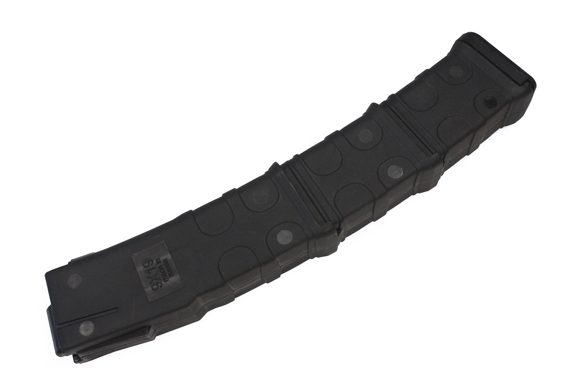 Рассчитан на 30 мест, но может быть уменьшен до 20 и 10. Для этого достаточно уменьшить корпус под выступом, предназначенным для установки тыльной крышки. Кроме шероховатой поверхности, внешние стенки покрыты рисунком-протектором, не дающим магазину скользить в руках;