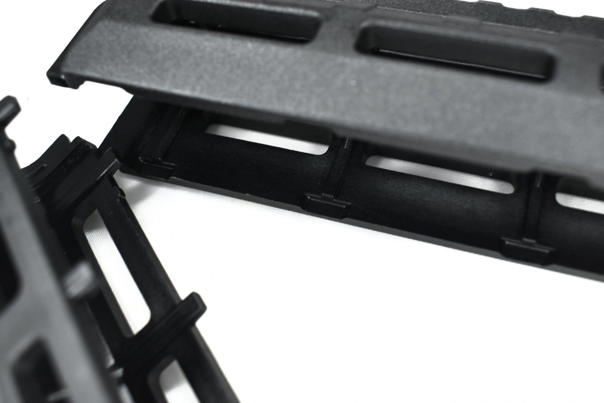 - База цевья с планкой Picatinny на 14 шагов, с каждой стороны есть по 3 разъема M-LOK и 6 разъемов сверху - итого 12.