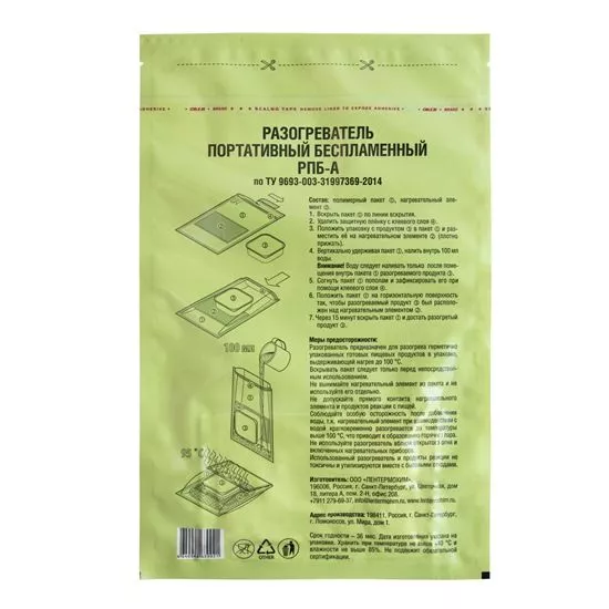 - Использованный нагревательный элемент вынуть из пакета и утилизировать с бытовыми отходами. Остаток воды, после подогрева, не использовать для питья.