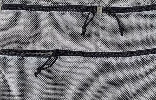 Основное отделение содержит три сетчатых кармана, закрывающихся на молнию, плоские карманы с внутренней панелью велкро и отделение для бутылки с водой.