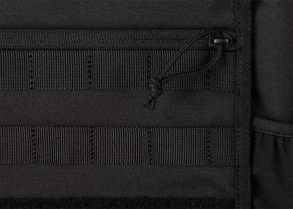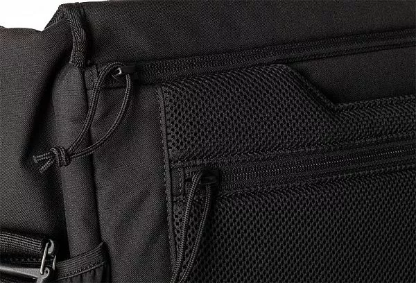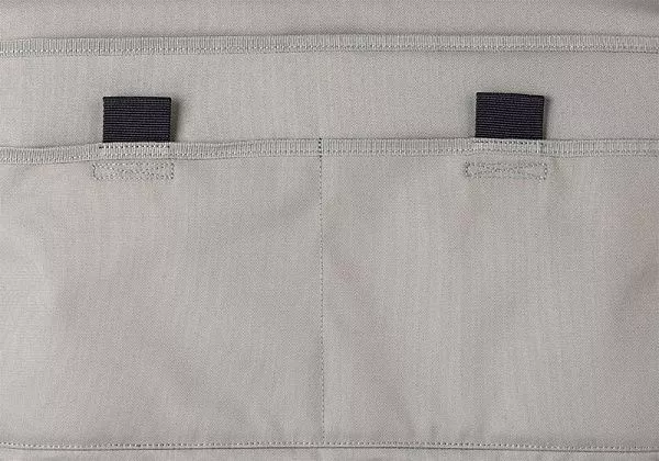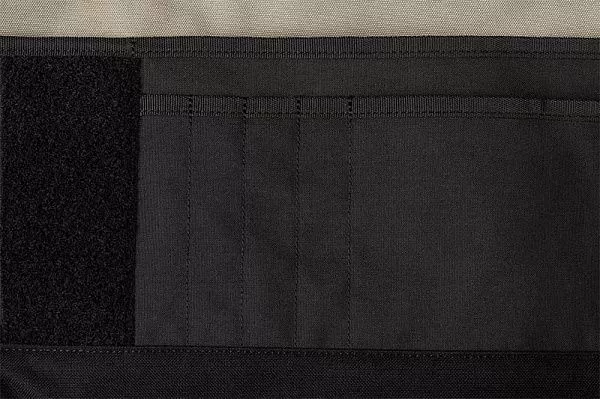 Очки, билеты на самолет, мультитул и другие аксессуары путешественника размещаются в двух внешних карманах, закрывающихся на молнию. Поверх карманов размещена панель MOLLE с велкро. Специальная сквозная пройма позволяет надевать сумку на выдвижную ручку большого багажа.