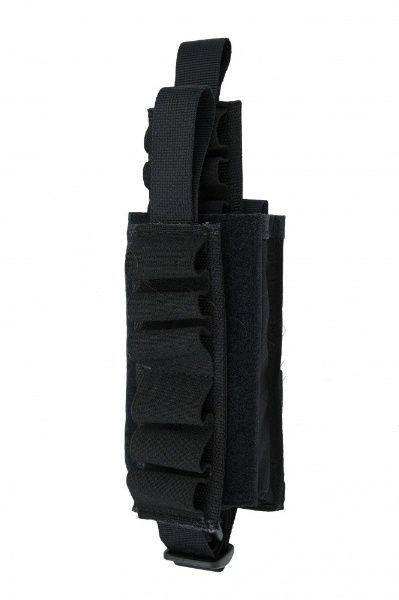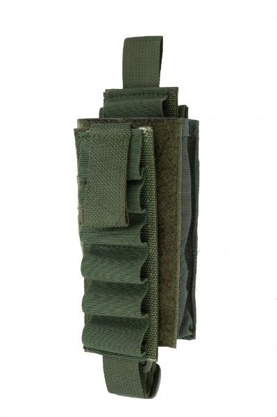 Подсумок на 12 патронов 12-го калибра MOLLE. Открытого типа, без клапана, для быстрого снаряжения патронами магазина помпового ружья 12–го калибра. Патроны закрепляются эластичной лентой с гнёздами на шесть патронов на двух съёмных планках из жесткой ременной ленты шириной 50 мм и длиной 140 мм с жесткой «липучкой».